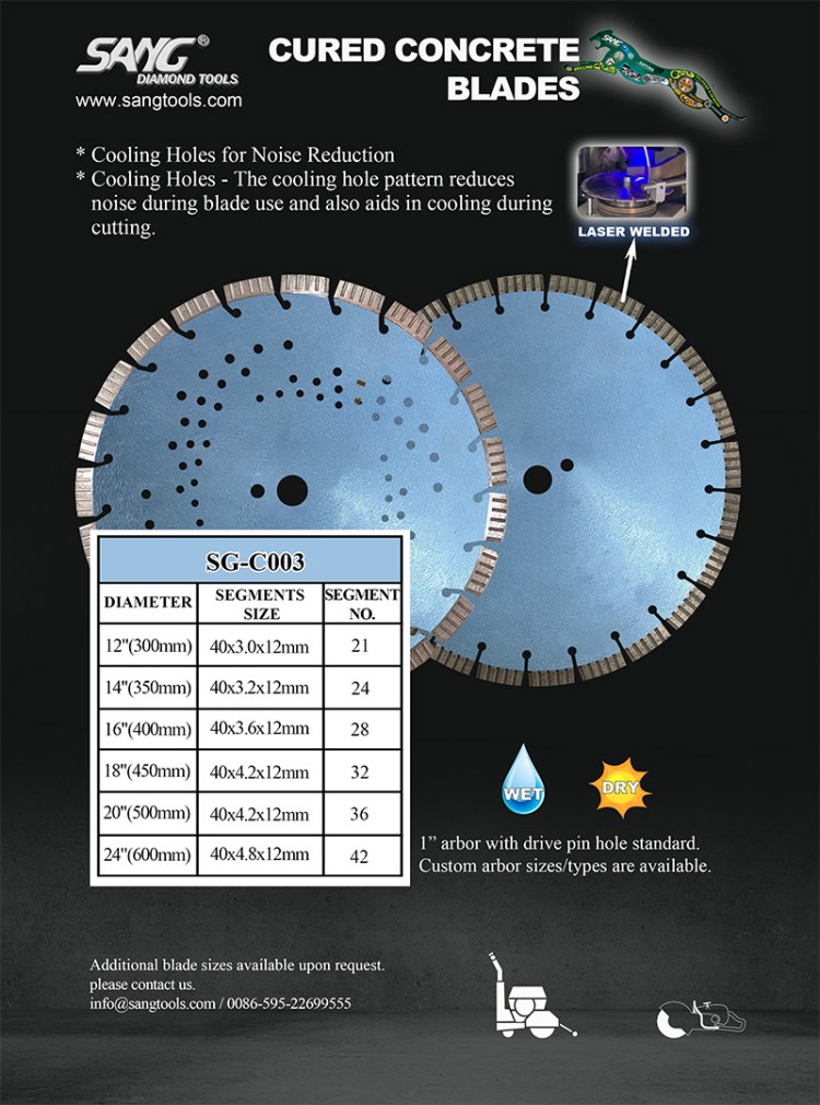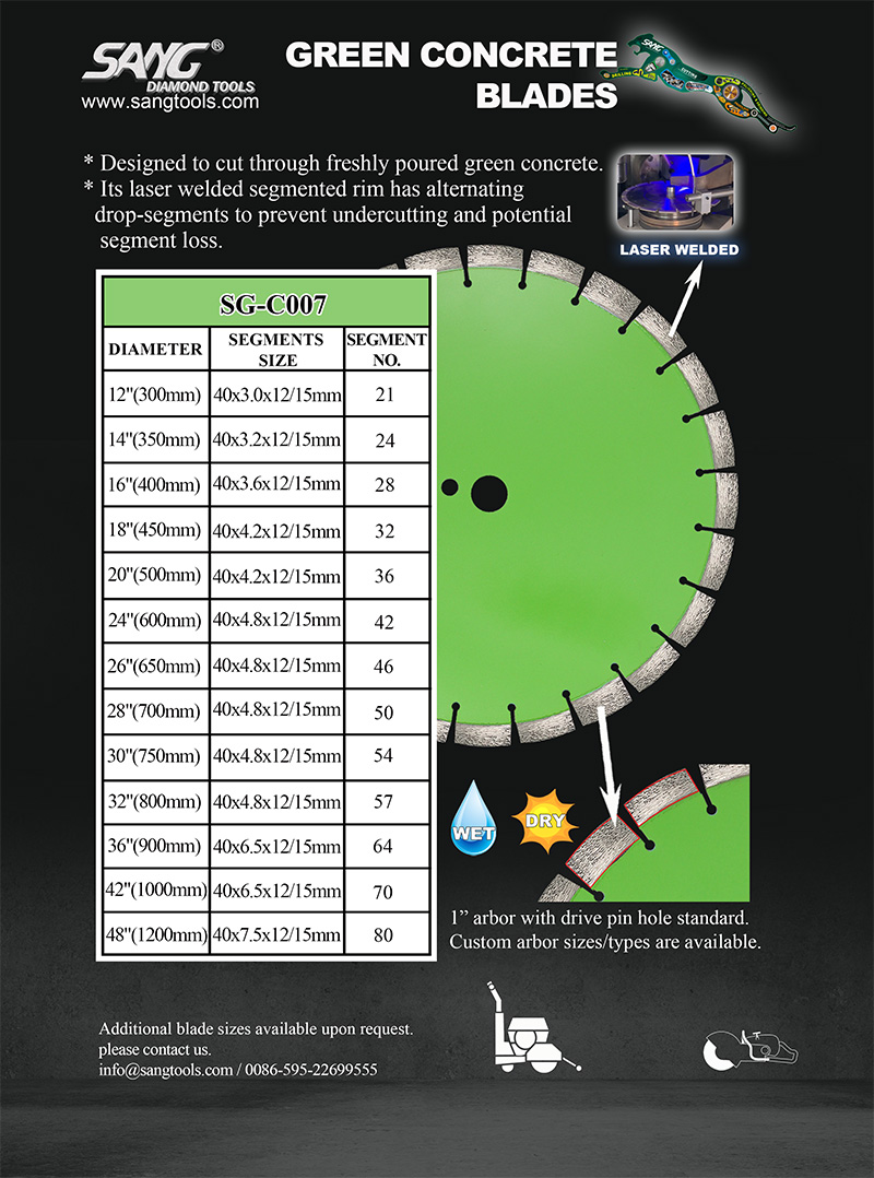 تیغه برش سبز SANG - مخصوص ارههای ورودی اولیه با ماتریس پیوند نرم برای مقابله با سایندگی بتن سبز طراحی شده است.